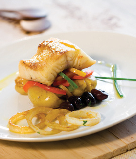 9. Distribua os ingredientes em quatro porções e coloque um pouco de molho sobre o bacalhau.