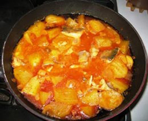 3. Acrescente o bacalhau e as batatas.