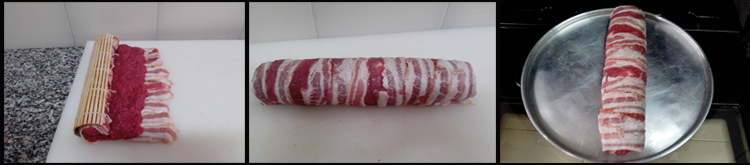 Sobre essa cama de bacon, disponha a carne moída temperada e abra-a deixando aparecer cerca de 2 cm de bacon para fechar e arrematar.