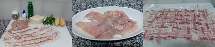 Sobre um papel filme ou um plástico culinário, trance o bacon fazendo uma rede tipo cesta.