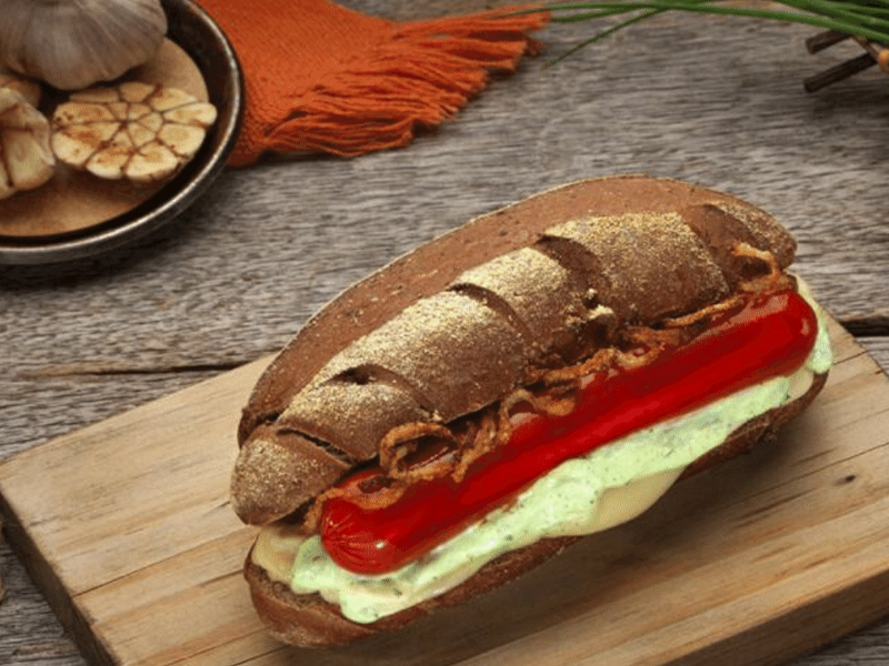 5. Monte o cachorro-quente com o patê, a salsicha e o alho-poró crispy.