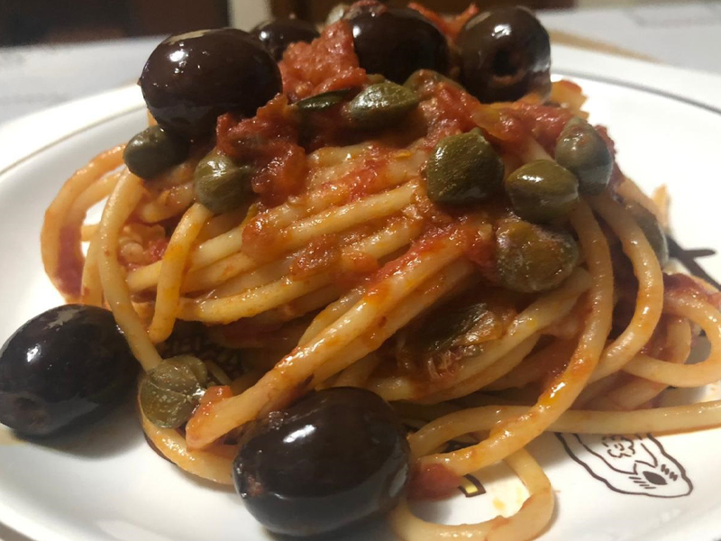 Depois adicione o aliche, as alcaparras, as azeitonas e o molho de tomate. Reserve.