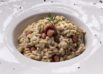 Refogue 1/4 de cebola picada com 20 gramas de manteiga. Acrescente o arroz carnaroli e deixe fritar por 5 minutos, sempre mexendo com uma colher. Adicione os pedaços de linguiça e misture.