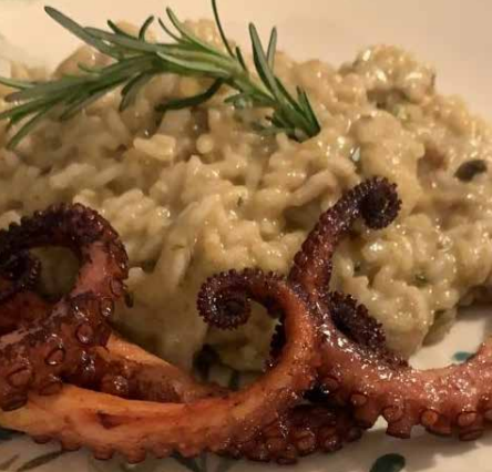 - Em outra frigideira, coloque um fio de azeite com uma colher de manteiga e os tentáculos de polvo. Salteie até ficarem crocantes e sirva-os junto com o risoto.