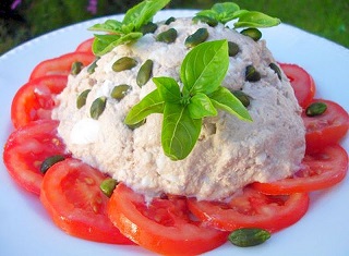 - Em um prato raso e liso, faça uma cama com os tomates em rodela e, com muito cuidado, acomode a forma virada ao contrário sobre o prato. Com a ajuda de um pano previamente aquecido, vá passando pelo bowl, para que a mousse se destaque e se acomode sobre a cama de tomates.