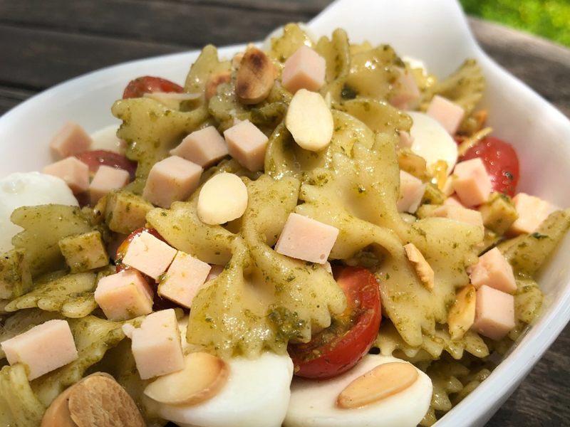 Acrescente o molho à massa e misture a muçarela de búfala cortada em fatias, o peito de frango em cubinhos e os tomatinhos-cereja cortados ao meio.