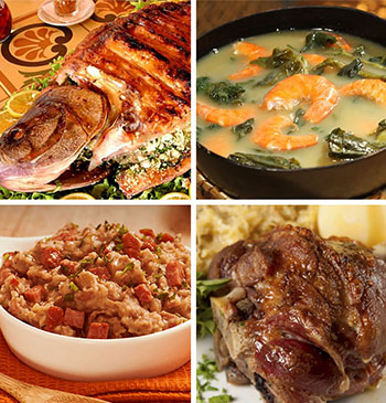Região Sul: barreado, boi ou porco no rolete, charque com inhame, chimarrão, churrasco, costela de ripa, joelho de porco cozido, marreco com maçã ou laranja, pinhão assado.