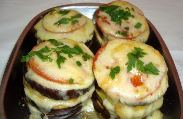 - Em uma forma ou refratário, monte uma rodela de berinjela, uma fatia de tomate temperada com azeite, pimenta moída na hora e sal e cebolas em rodelas. Coloque uma fatia de mussarela e salpique parmesão ralado.