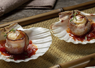 Sirva na concha da própria vieira com meia colher de café de geleia de tomate e algumas folhinhas de tomilho.