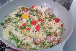 - Acrescente o arroz e a água quente e deixe cozinhar uns 20 minutos.