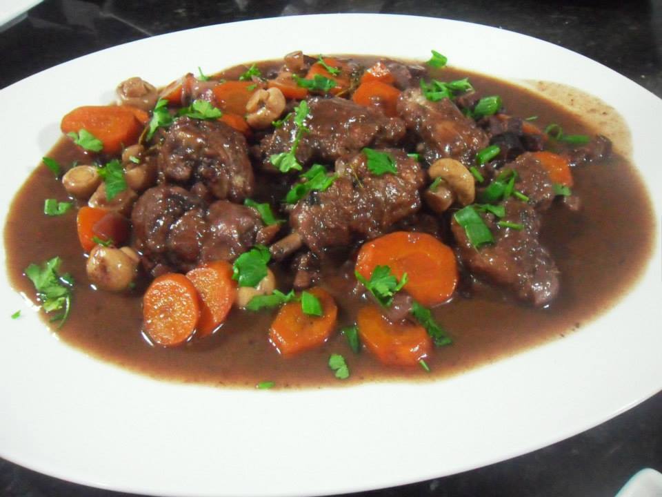 - Conforme o guisado abaixar seu líquido de cocção (deixando descoberta parte dos ingredientes), junte uma concha do caldo de frango. Faça isso mais umas 3 vezes, depois deixe o guisado espessar seu caldo de cozimento por cerca de 2 horas em fogo bem lento e tampado.