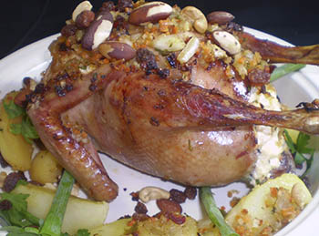- Recheie o faisão com a farofa (não precisa fechar) e coloque-o numa forma próprio para levar ao forno, derramando a marinada por cima do faisão. Regue com azeite a gosto.