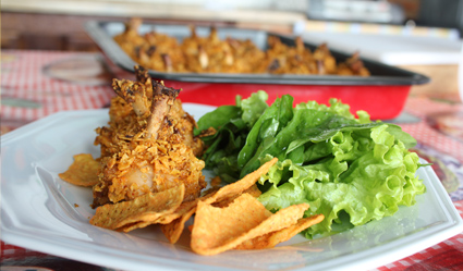 - Em outra tigela, coloque 2 xícaras (chá) bem cheias de nachos quebrados com as mãos, 1 pacote de sopa de cebola (65 g) e misture bem. Passe as drumets de frango (reservadas acima) nesta mistura, pressionando bem.