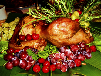 - Sirva o peru com decoração tropical semelhante à foto (folhas de bananeira, flores, uvas, cerejas, abacaxi) ou então com outros ingredientes de sua preferência.