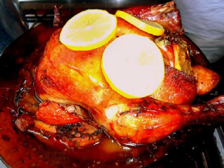 - Após assado e bronzeado, transfira o peru para uma travessa de bom tamanho e passe a manteiga restante nele todo, para dar brilho e sabor.