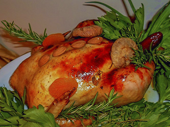 - Recheie o peru com as frutas secas (3 tâmaras, 6 damascos, 4 ameixas, 14 amêndoas, 6 figos turcos, um pouco do salsão da marinada, os condimentos secos (sal, pápricas, pimentas, açafrão), as cebolas restantes, os cravos, metade das ervas (a outra metade deixe reservada para a decoração), alhos e 50 gramas da manteiga.