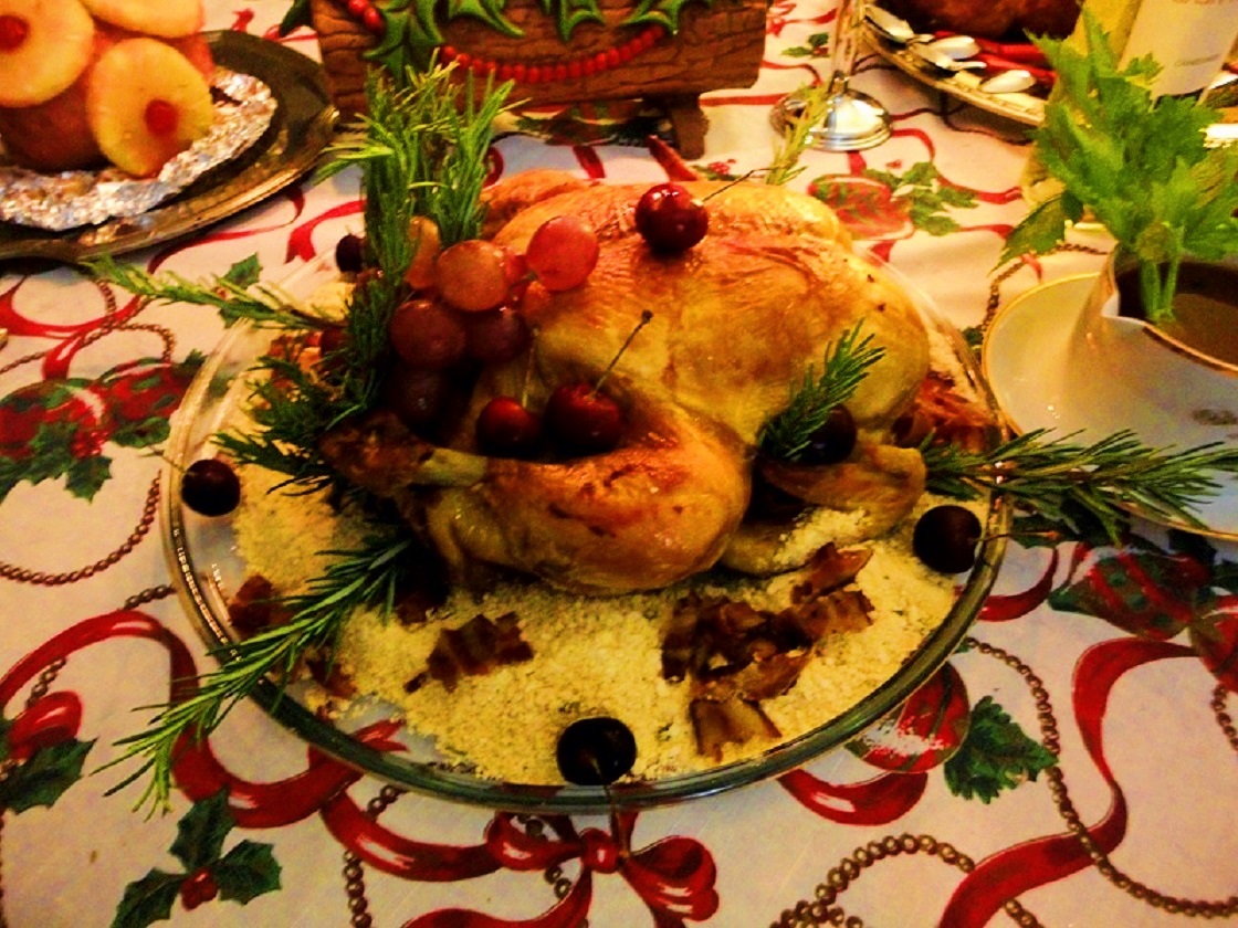 - Decore com as frutas secas restantes e com as ervas, folhas e galhos do salsão e com o mais lhe agradar (tenha m cuidado especial para esconder, com a decoração, a parte das pernas do peru que foram amarradas com o barbante).