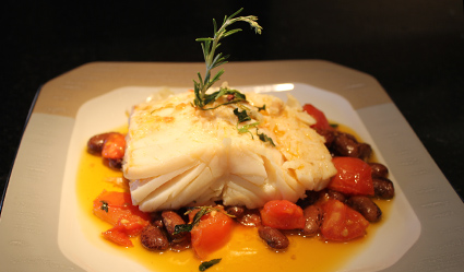 - Para montar o prato, faça uma cama com o tomate e as favas refogadas e deite uma posta de bacalhau. Decore com alecrim fresco e tomilho e sirva imediatamente.