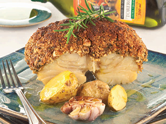 - Cubra as postas de bacalhau, pelo lado da pele, com a farofa de pão italiano e as castanhas e coloque-as no mesmo refratário das batatas.