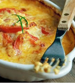 - Na pentola, arrume o bacalhau no meio, as fatias de batatas ao lado e despeje o creme. Deite as fatias de tomate uma a uma.