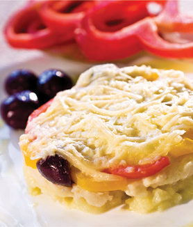 - Em um refratário retangular, distribua o purê, em seguida o bacalhau, a cebola, o pimentão e as azeitonas.