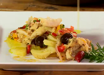 3. Faça camadas com os ingredientes pré-preparados na seguinte ordem: azeite, batatas, sal, pimenta do reino, azeite, tomates, sal, pimenta do reino, azeite, pimentões, sal, pimenta do reino, azeite, cebolas, sal, pimenta do reino, azeite, azeitonas, bacalhau e azeite.