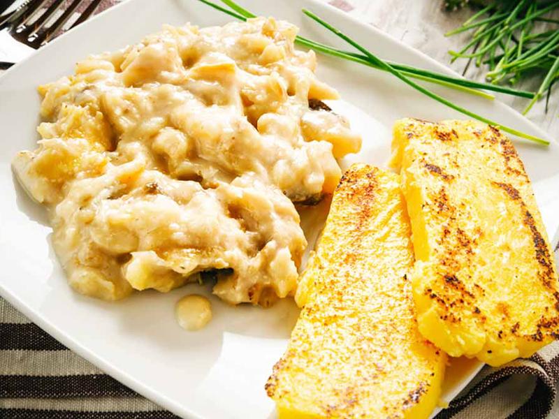 8. Enquanto isso, prepare uma polenta bem cremosa ou então grelhe algumas fatias de polenta para servir com o bacalhau quando ele estiver pronto.