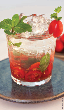 - Decore a borda do copo com um tomate e um galhinho de hortelã.