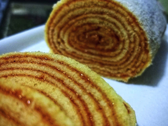 Faça o mesmo processo com as outras 4 camadas que você terá que assar para formar o bolo. Dica: dá para usar o mesmo papel para assar as 5 camadas, basta você tirar os resíduos da massa anterior. Lembrando que a primeira massa enrolada é colocada em cima da segunda aberta para então ser enrolada e assim sucessivamente com a terceira, a quarta e a quinta massa. Sempre com ela quente ainda, porque isso ajuda no processo de enrolar.