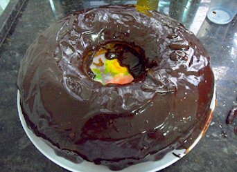 - Quando o bolo estiver morno, retire-o da assadeira e cubra-o com a calda de gianduia (ela deve estar morna para fria), distribuindo-a por toda a superfície.