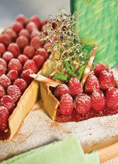 Informações adicionais: Substitua a framboesa por morango e a geléia de framboesa por geléia de morango. Nesse caso, em lugar do açúcar de confeiteiro, cubra os morangos com 3 colheres de sopa de geléia diluída em água e aquecida em banho-maria. Se quiser, faça tortinhas individuais.