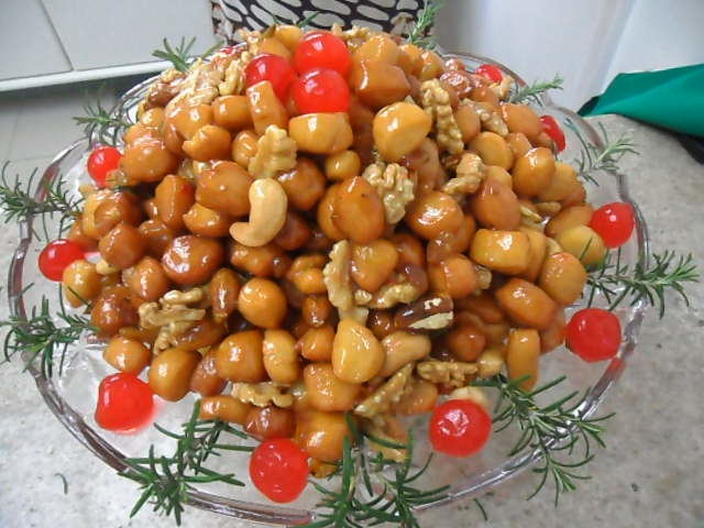 • 100 gramas de mix de frutas secas e desidratadas (damascos, tâmaras, uvas passas, amêndoas, nozes, avelãa etc. Triture metade e a outra metade deixe para enfeitar)