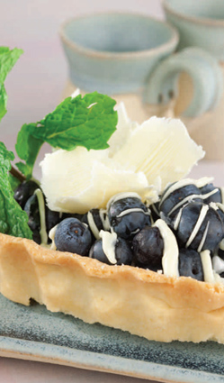 Misture o creme chantilly com os mirtilos. Despeje o preparado na massa da torta. Sobre o creme, coloque alguns mirtilos frescos e inteiros. Decore com fios de chocolate branco derretido. Coloque no refrigerador e sirva frio.