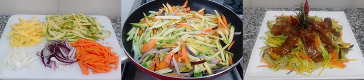 Em uma travessa apropriada, coloque os legumes e disponha a carne sobre eles.
