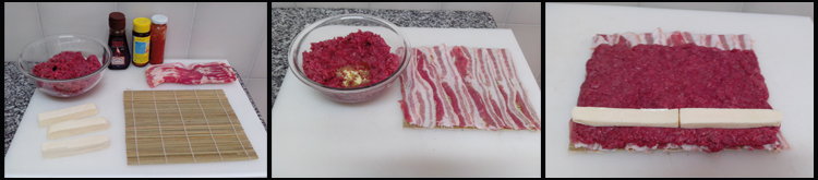 Sobre essa cama de bacon, disponha a carne moída temperada e abra-a deixando aparecer cerca de 2 cm de bacon para fechar e arrematar.