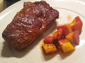Tempere o bife com sal e pimenta e sele-o em uma frigideira quente antiaderente destampada por 4 minutos de cada lado. Ao terminar, regue com um fio de azeite e tampe até que as batatas fiquem prontas.