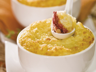 Em uma travessa, adicione o purê na parte central, coloque as fatias de cupim ao redor e acrescente as ceboletes por cima da carne. - Observações: