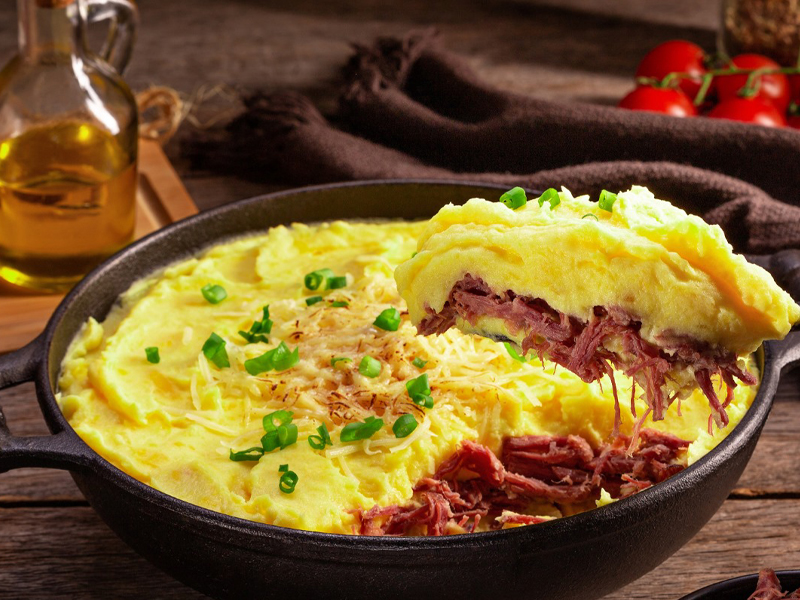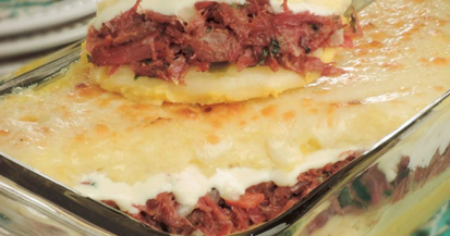 Em uma travessa untada com manteiga, coloque uma camada de purê, depois o recheio de picanha, em seguida uma camada de requeijão cremoso e, por fim, o restante do purê.