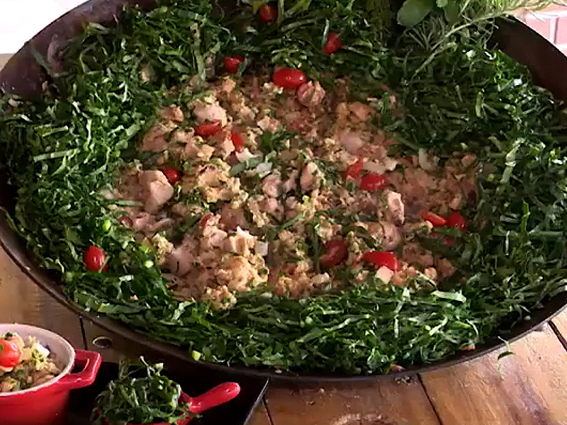 Quando a couve estiver no ponto, transfira-a para a panela com o feijão tropeiro.
