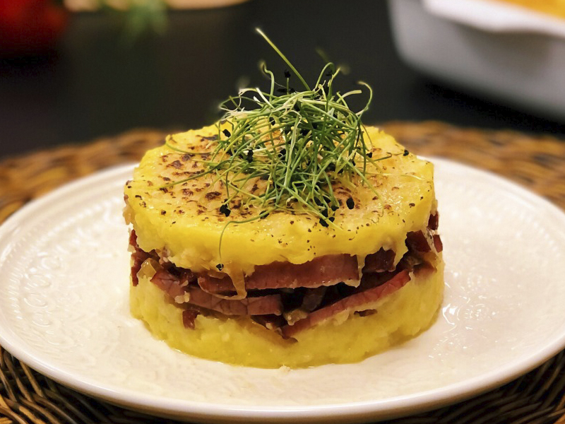 Em um refratário grande, faça uma camada de purê de abóbora, espalhe metade da muçarela por cima e faça uma camada com o refogado de carne-seca. Depois espalhe o requeijão por cima, cubra com o purê de mandioca e polvilhe com a muçarela restante.