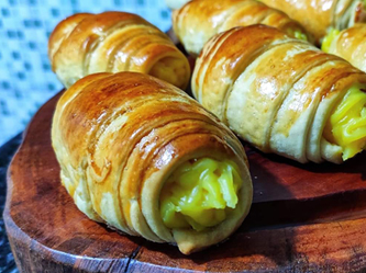 Divida a massa em 2 partes iguais e abra-a com um rolo. Com o auxílio de um cortador de massa ou faca, corte tiras de 25 cm de comprimento e 3 cm de largura. Enrole em canudos de alumínio (daqueles usados para fazer cannolis) untados com manteiga. Distribua os rolinhos em uma assadeira untada com manteiga e enfarinhada e deixe descansando por mais 1 hora.