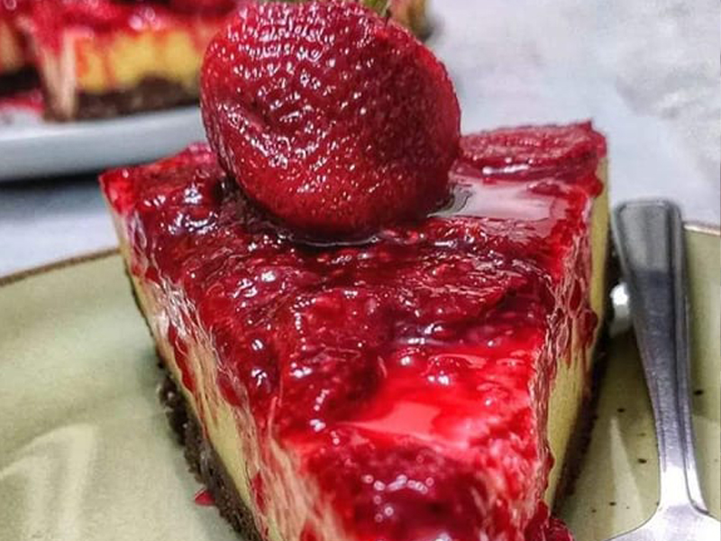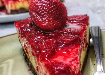 Na hora de servir, espalhe a geleia sobre o cheesecake e decore com os morangos cortados ao meio ou inteiros, como for de sua preferência.