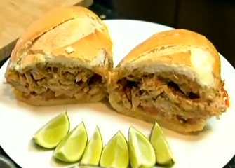 - Disponha as fatias do pernil no pão com duas conchas de molho de pimentões e vinagrete a gosto. Sirva com fatias de limão.