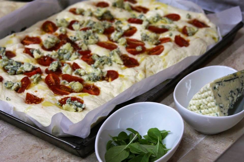 - Pressione a massa com os dedos, regue azeite, sal grosso e "plante" alecrim fresco.