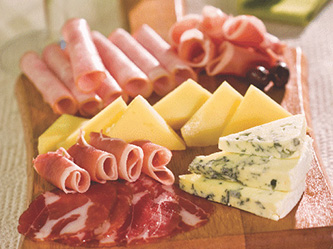 - Disponha os frios e os queijos em uma tábua de madeira e decore com azeitonas.