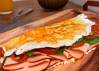 Enquanto o queijo fica crocante e dourado, recheie com o queijo cremoso, o peito de frango, os tomatinhos cortados e as folhas de espinafre.