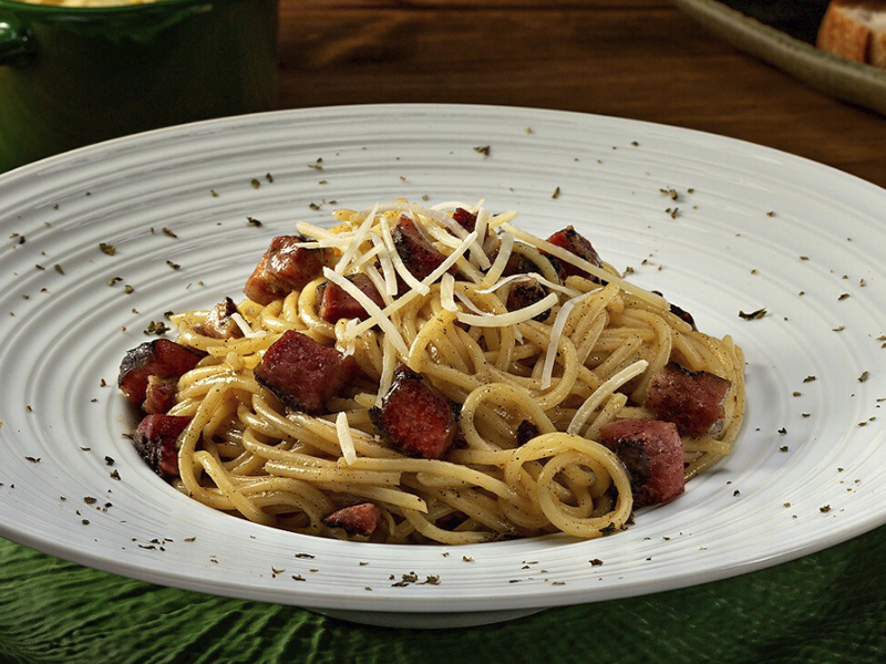 Desligue o fogo, adicione o creme preparado anteriormente e misture. O próprio calor da massa dará ao mix de queijo e ovo uma consistência bem cremosa. Se necessário, para dar o ponto ideal, utilize um pouco da água do cozimento.