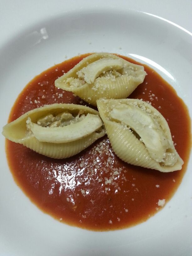 - Coloque o molho ao sugo no fundo de um refratário e arrume os conchiglionis recheados sobre o molho.