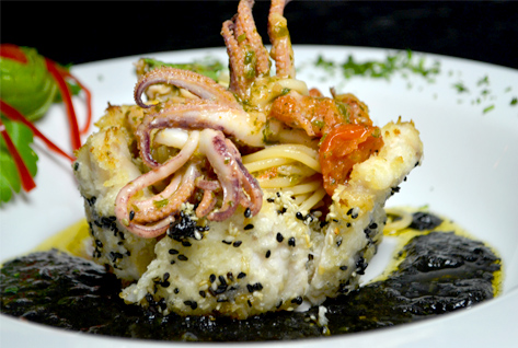 - Retire do filé de badejo as lascas e passe-as no azeite e no gergelim, forrando depois com um aro.