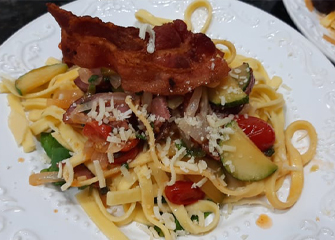 Finalize decorando com o bacon frito e salpicando parmesão.
